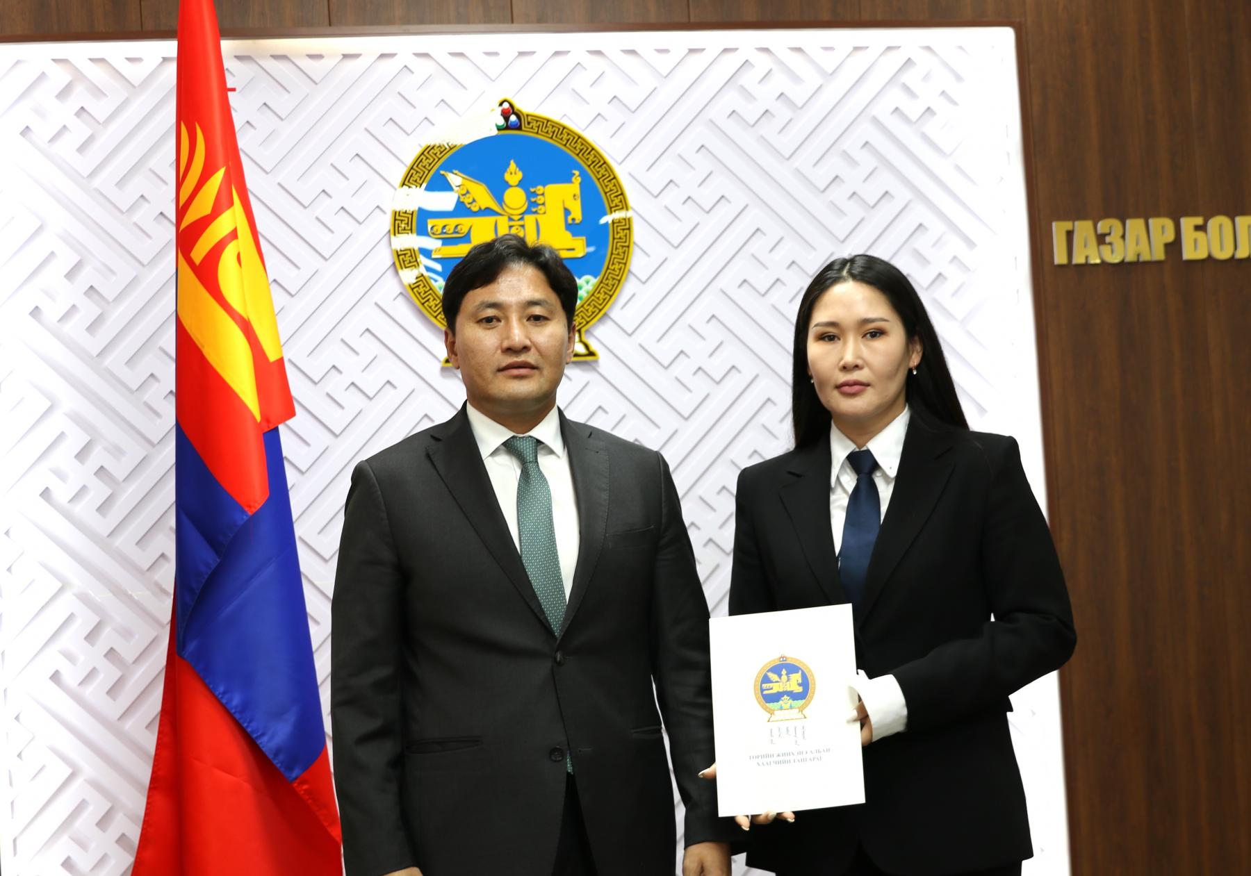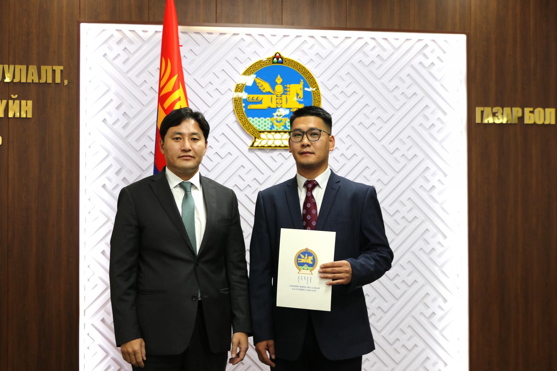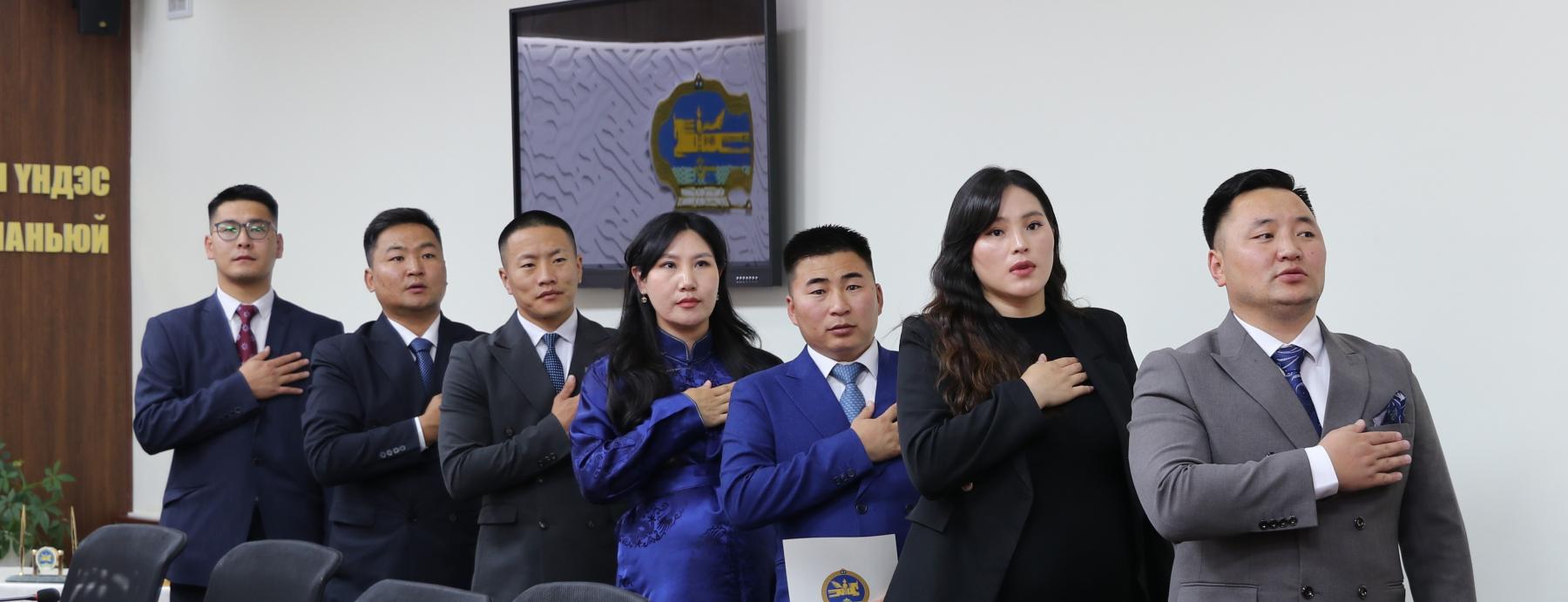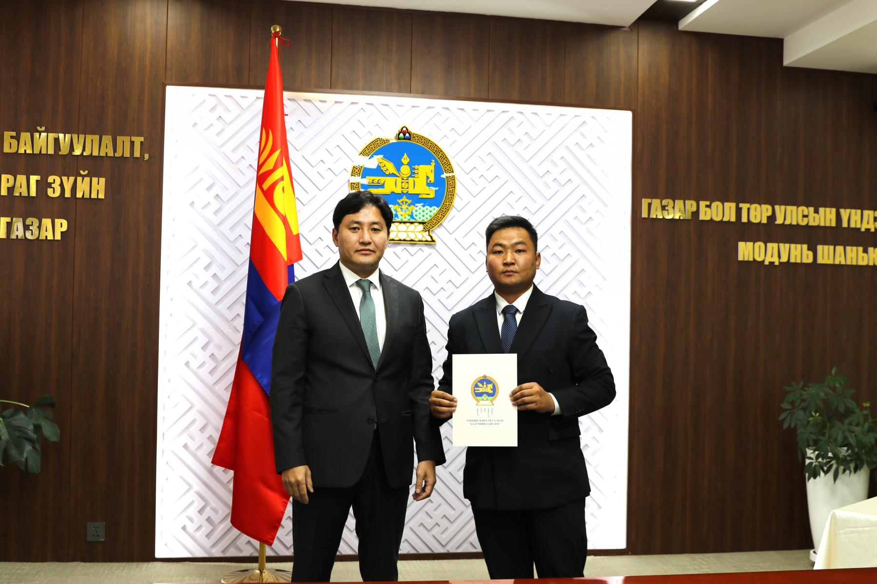 Өнөөдөр Засгийн газрын агентлагийн эрх зүйн байдлын тухай хуулийн 8 дугаар зүйлийн 8.4 дэх хэсэг, Төрийн албаны тухай хуулийн 36 дугаар зүйлийн 36.1 дэх хэсэг, Монгол Улсын Ерөнхийлөгчийн 2024 оны 84 дүгээр зарлигаар батлагдсан “Төрийн жинхэнэ албан хаагчийн тангараг өргөх ёслолын журам”, Төрийн албаны зөвлөлийн 2024 оны 402 дугаар тогтоолоор батлагдсан “Төрийн албан тушаалд туршилтын хугацаа хэрэглэх болзол, журам”-ыг тус тус үндэслэн Газар зохион байгуулалт, геодези, зураг зүйн ерөнхий газар болон Нийслэлийн газар зохион байгуулалтын албаны дараах албан хаагчдыг “Төрийн жинхэнэ албан хаагчийн тангараг” өргүүллээ. Үүнд: