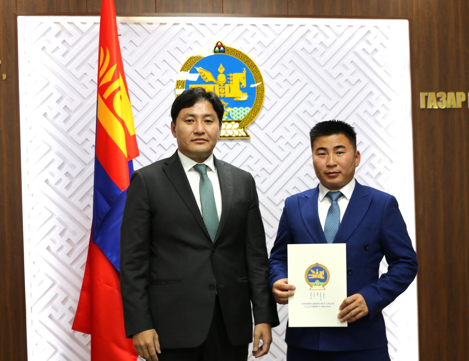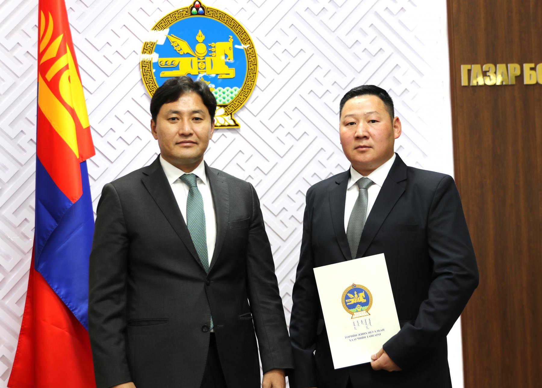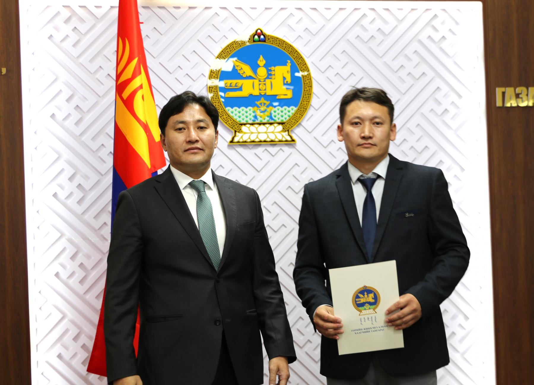 Өнөөдөр Засгийн газрын агентлагийн эрх зүйн байдлын тухай хуулийн 8 дугаар зүйлийн 8.4 дэх хэсэг, Төрийн албаны тухай хуулийн 36 дугаар зүйлийн 36.1 дэх хэсэг, Монгол Улсын Ерөнхийлөгчийн 2024 оны 84 дүгээр зарлигаар батлагдсан “Төрийн жинхэнэ албан хаагчийн тангараг өргөх ёслолын журам”, Төрийн албаны зөвлөлийн 2024 оны 402 дугаар тогтоолоор батлагдсан “Төрийн албан тушаалд туршилтын хугацаа хэрэглэх болзол, журам”-ыг тус тус үндэслэн Газар зохион байгуулалт, геодези, зураг зүйн ерөнхий газар болон Нийслэлийн газар зохион байгуулалтын албаны дараах албан хаагчдыг “Төрийн жинхэнэ албан хаагчийн тангараг” өргүүллээ. Үүнд: