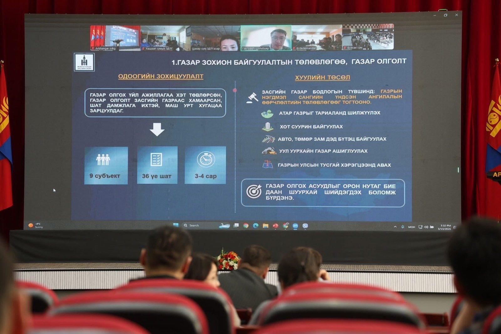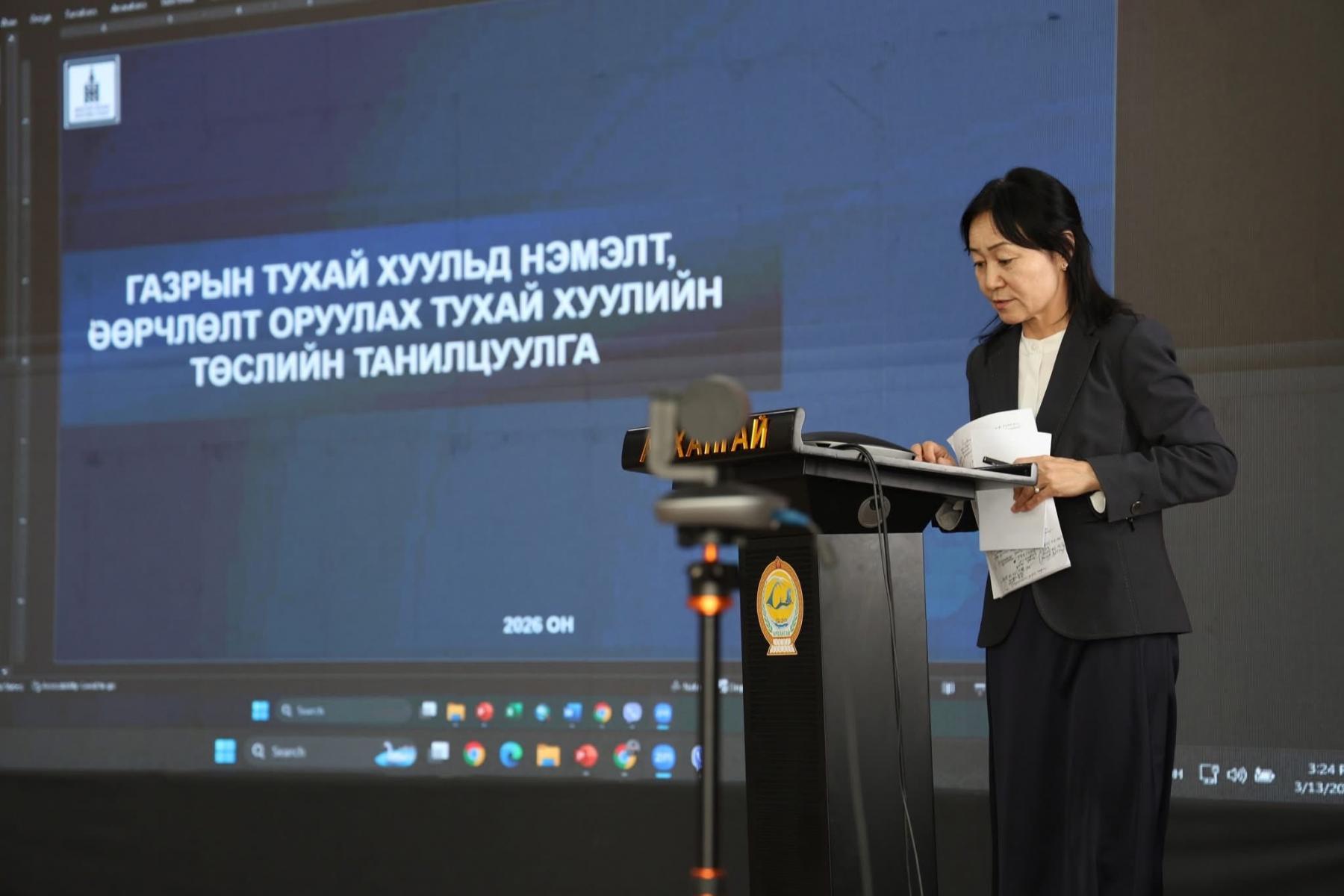 Газрын тухай хуульд нэмэлт, өөрчлөлт оруулах тухай хуулийн төслийн хэлэлцүүлгүүд хуваарийн дагуу орон нутагт зохион байгуулагдаж байгаа бөгөөд 2026 оны 03 дугаар сарын 16-ны өдрийн 12:00 цагт Хэнтий аймгийн Спорт хорооны зааланд, 2026 оны 03 дугаар сарын 17-ны өдрийн 10:00 цагт Сүхбаатар аймгийн Засаг даргын тамгын газрын хурлын танхимд, Дорнод аймгийн Засаг даргын тамгын газрын 3 давхрын хурлын танхимд тус тус зохион байгуулагдах тул та бүхнийг хүрэлцэн ирэхийг урьж байна.