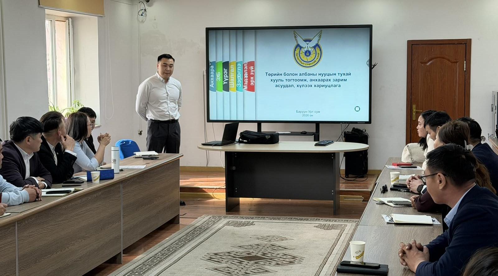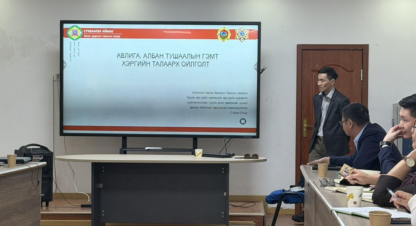 2026 оны 03 дугаар сарын 12-13-ны өдрүүдэд байгууллагын нийт албан хаагчдад “Ёс зүйн манлайлал ба хувь хүний хөгжил” сэдвээр Ёс зүйн академийн ерөнхийлөгч Ж.Ойнмандах, Төрийн албан хаагчийн Ёс зүйн тухай хуулийн хүрээнд “Төрийн албан хаагчийн ёс зүйн хэм хэмжээ, эрхэмлэн дээдлэх үнэт зүйлс” сэдвээр Захиргаа хуулийн асуудал хариуцсан ахлах мэргэжилтэн Э.Алтанчимэг, “Төрийн болон албаны нууцын тухай хууль тогтоомж, анхаарах зарим асуудал, хүлээх хариуцлага” сэдвээр ТЕГ-н Сүхбаатар аймаг дахь хэлтсийн ажилтан Э.Төрхүү, “Авилга, албан тушаалын гэмт хэргийн ойлголт, түүнээс урьдчилан сэргийлэх” сэдвээр аймгийн ЗДТГ-ын хуулийн хэлтсийн Эрх зүйн зөвлөгөө, сургалт, сурталчилгаа хариуцсан ахлах мэргэжилтэн С.Бат-Очир, “Ажлын байрны эерэг соёл” сэдвээр Соёл, урлаг, аялал жуулчлал, залуучуудын газрын ахлах мэргэжилтэн А.Магадцэцэг нартай хамтран сургалтыг зохион байгуулж ажилчдын ёс зүй, эрх зүйн мэдлэгийг дээшлүүлэн ажиллалаа.