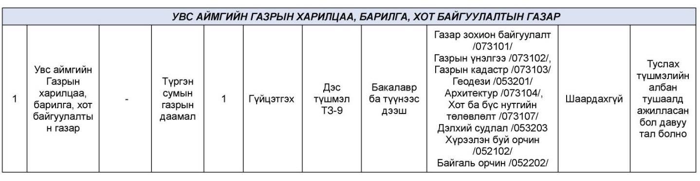 Төрийн албаны зөвлөлийн 2023 оны 25 дугаар тогтоолоор батлагдсан Төрийн албаны шалгалт өгөх болзол болон шатлан дэвшүүлэх, сонгон шалгаруулах журмын 4 дүгээр зүйлийн 4.2-т заасны дагуу төрийн өөр байгууллага, нэгж хооронд шилжин ажиллахыг хүссэн төрийн холбогдох бусад байгууллагад ажиллаж байгаа төрийн жинхэнэ албан хаагчдыг дараах албан тушаалуудад холбогдох материалаа цахим шуудангаар ирүүлэхийг урьж байна.