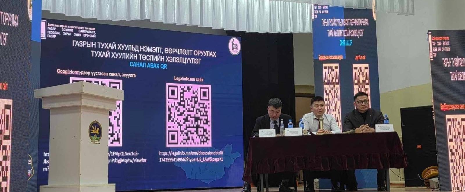 Газрын тухай хуульд нэмэлт, өөрчлөлт оруулах тухай хуулийн төслийн хэлэлцүүлгүүд хуваарийн дагуу орон нутагт зохион байгуулагдаж байгаа бөгөөд 2025 оны 03 дугаар сарын 12-ны өдөр Төв аймгийн Зуунмод сумын Соёлын төвд 11:00, Баян-Өлгий аймгийн Төрийн үйлчилгээний төвийн 6 давхрын хурлын танхимд 14:00, Дорноговь аймгийн Соёмбо цогцолборт 14:00, Увс аймгийн Засаг даргын тамгын газрын хурлын танхимд 11:00 цагуудад тус тус зохион байгуулагдах тул та бүхнийг хүрэлцэн ирэхийг урьж байна.