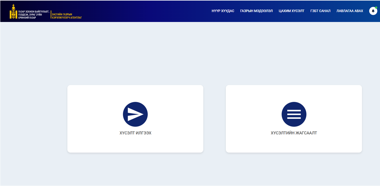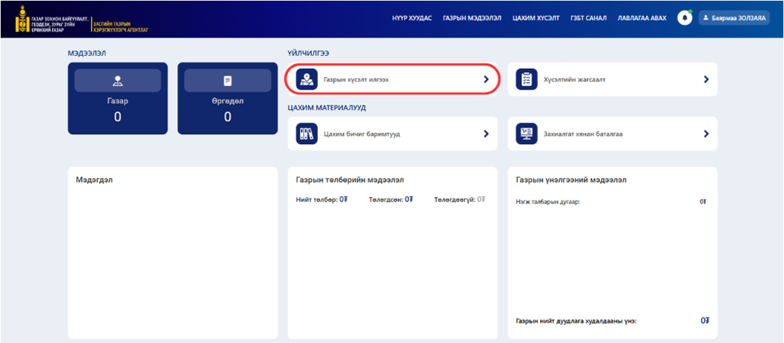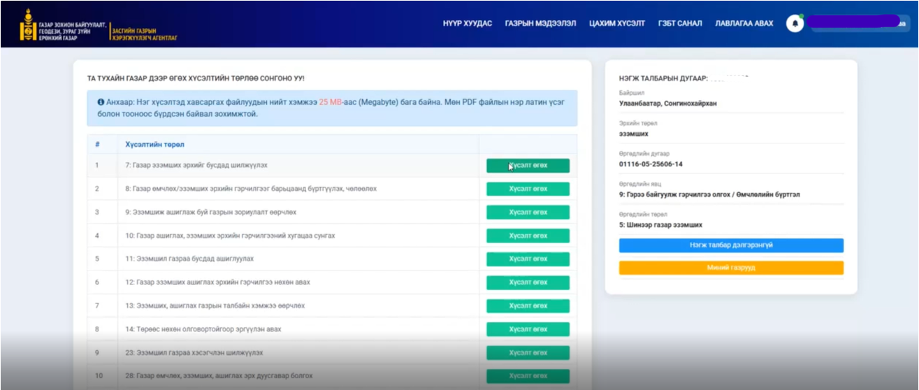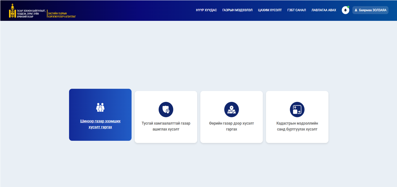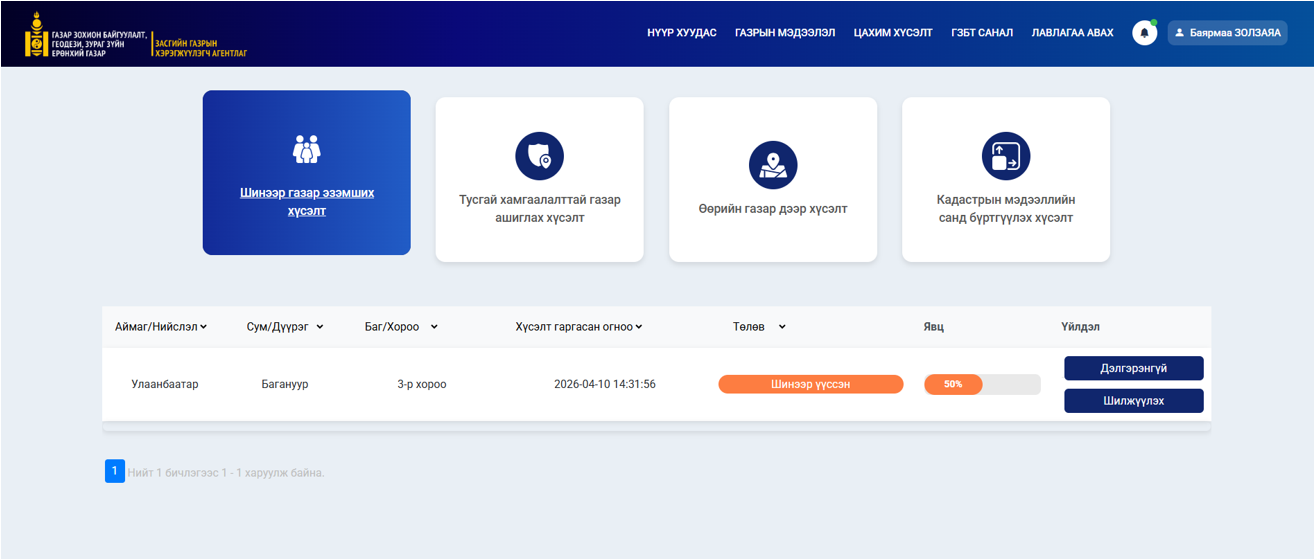 Шинээр газар эзэмших хүсэлт гаргах цэсийг сонгож орсноор илгээсэн хүсэлтээ харах боломжтой