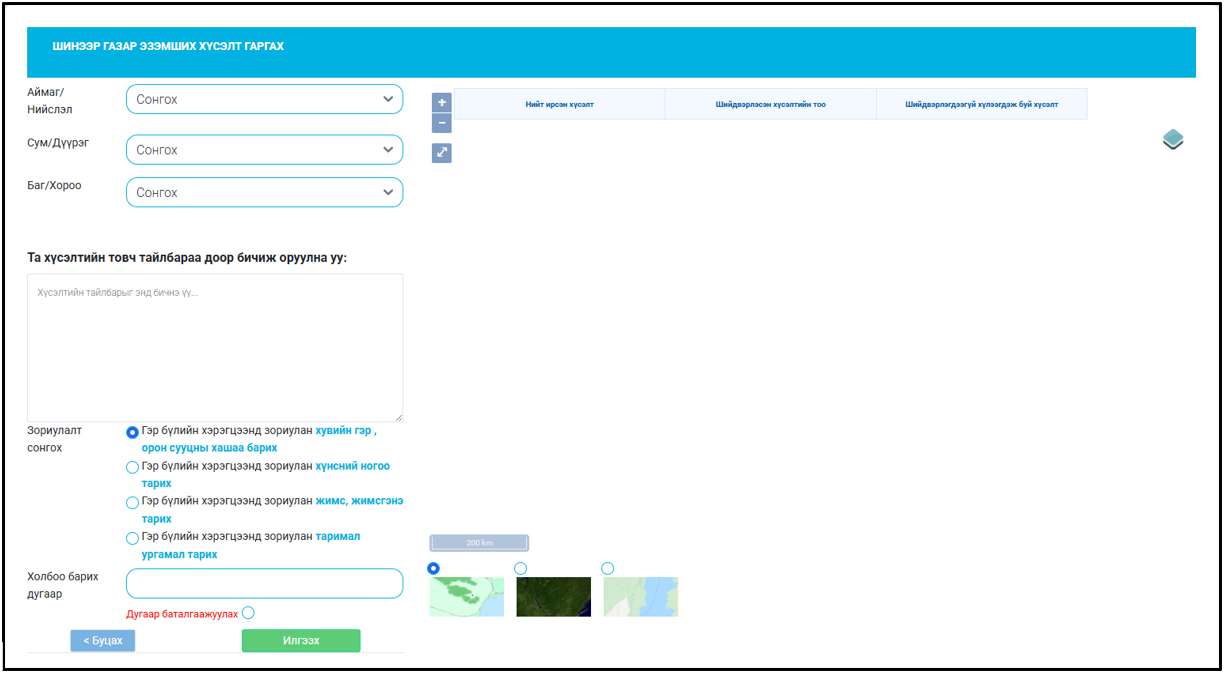 Хүсэлт илгээх газрынхаа байршил болон зориулалтыг сонгоод, хүсэлтийн товч тайлбараа бичээд хүсэлтээ илгээнэ.