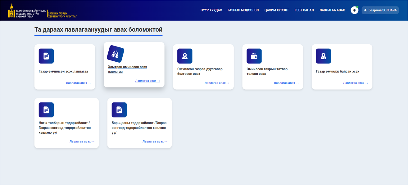 Шилжүүлэх гэж буй газраа идэвхжүүлэн газар эзэмших эрхийг бусдад шилжүүлэх хэсгийг сонгон хүсэлт өгөх хэсгийг сонгоно.