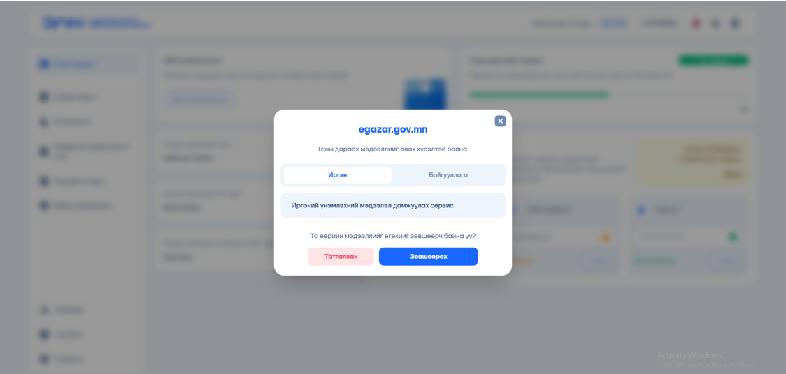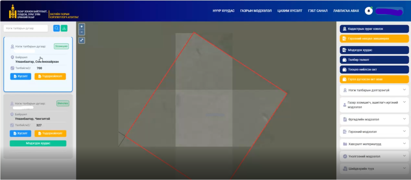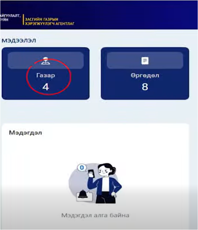 Та egazar.gov.mn сайт руугаа иргэний дан систем эсвэл банкны эрхээрээ нэвтрэн ороод “Газар” хэсэг дээр даран, өөрийнхөө өмчилж, эзэмшдэг газрынхаа мэдээллийг харах боломжтой.