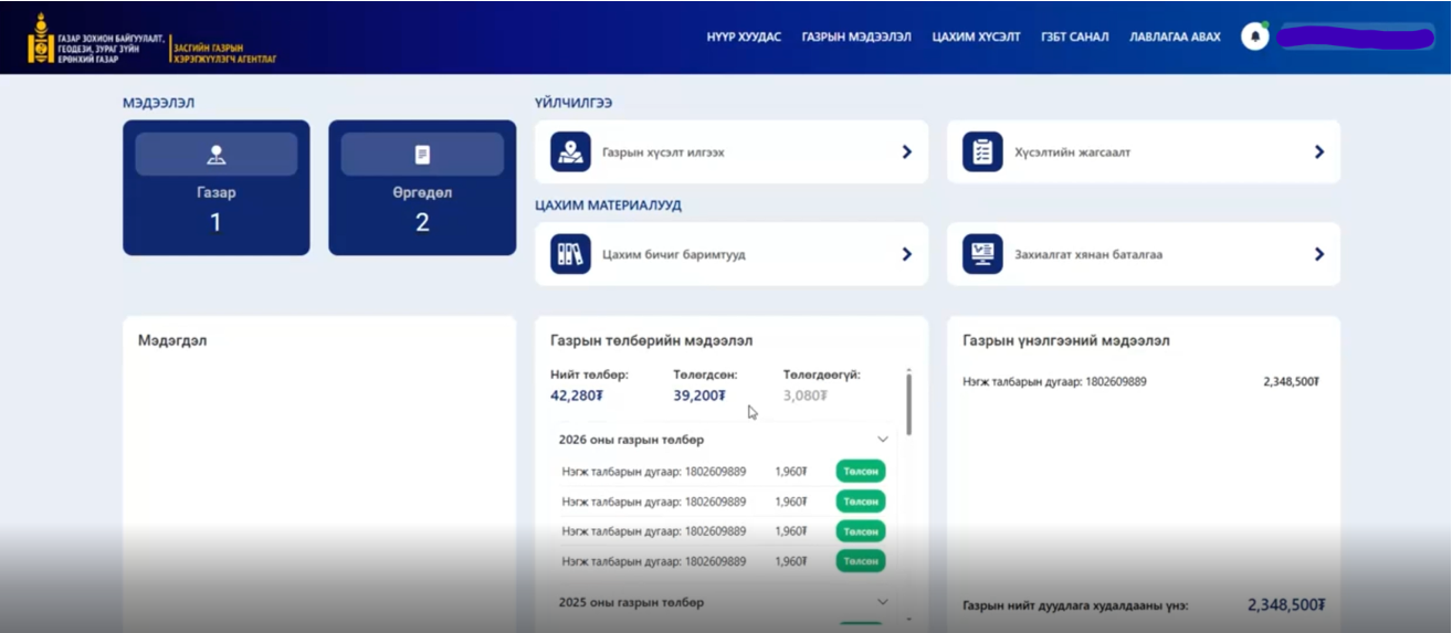 Төлбөр төлөлт хэсгээс тухайн газрын төлбөр татварыг төлөх нэхэмжлэлийн дугаар, QR-г авах боломжтой.