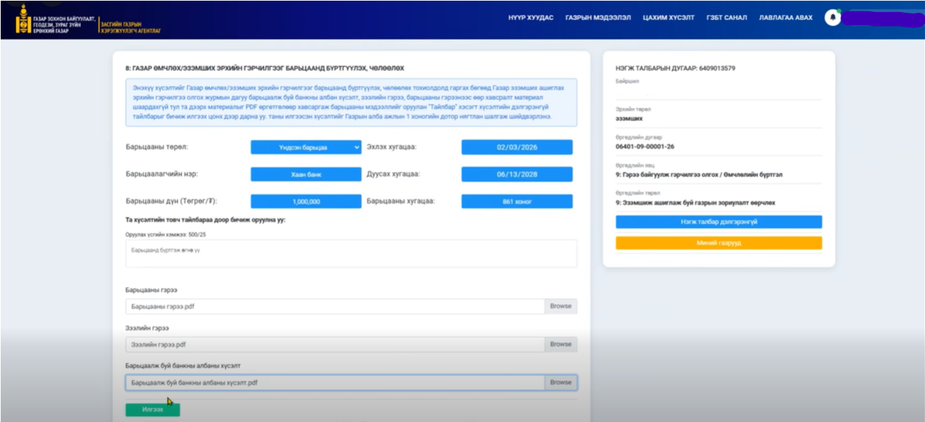 Барьцаа хөрөнгөд бүртгүүлэх гэж буй газраа идэвхжүүлэн “Газар өмчлөх, эзэмших эрхийн гэрчилгээг барьцаанд бүртгүүлэх, чөлөөлөх” хэсгийг сонгон хүсэлт өгөх хэсгийг сонгоно.